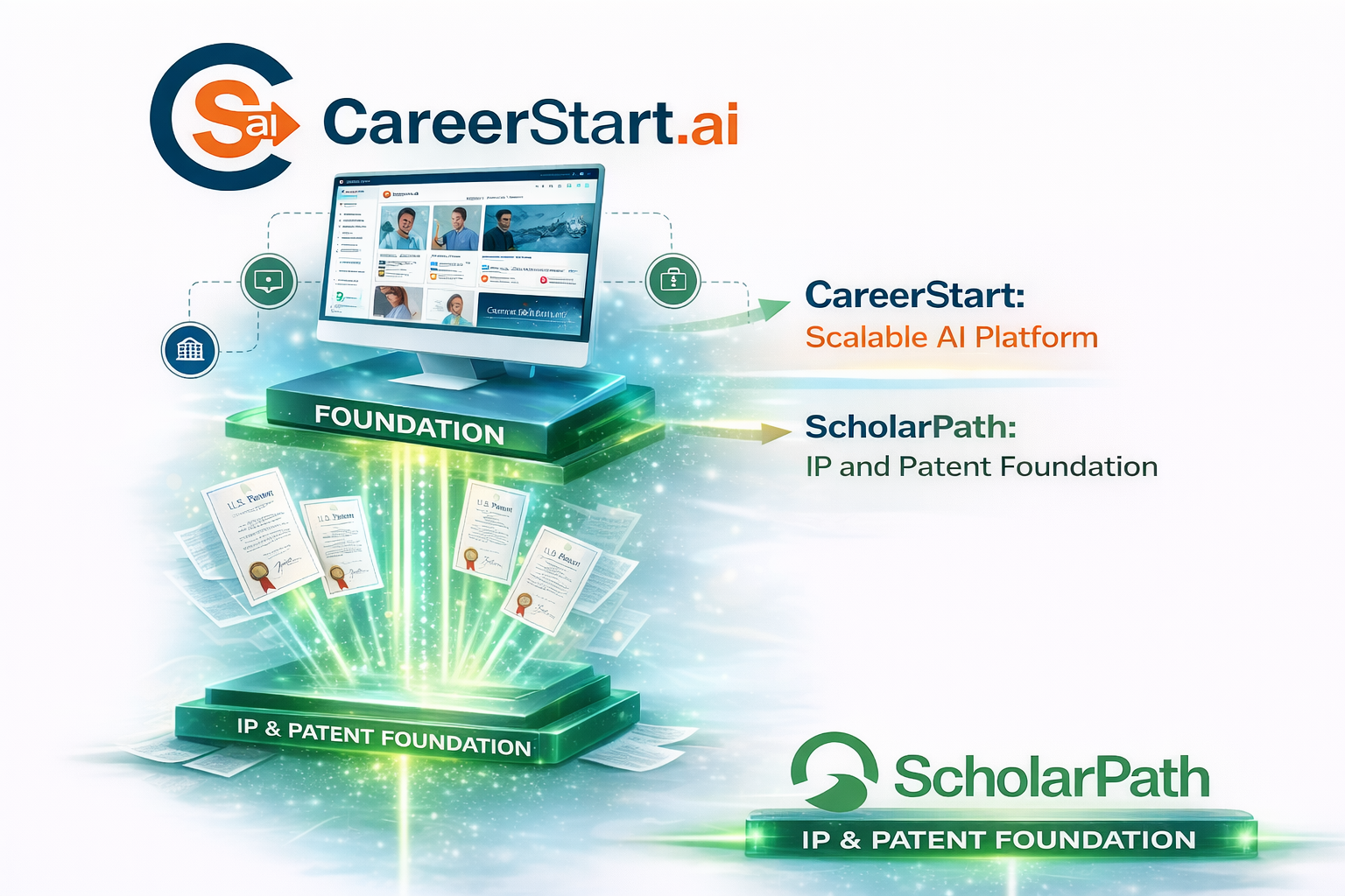CareerStart and ScholarPath are separate companies, with CareerStart operating the scalable AI platform and ScholarPath providing the underlying intellectual property and patent foundation.